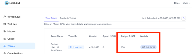 On the LiteLLM UI, Navigate to Teams, You should see the new team Production LLM Evals Group auto-created on LiteLLM.